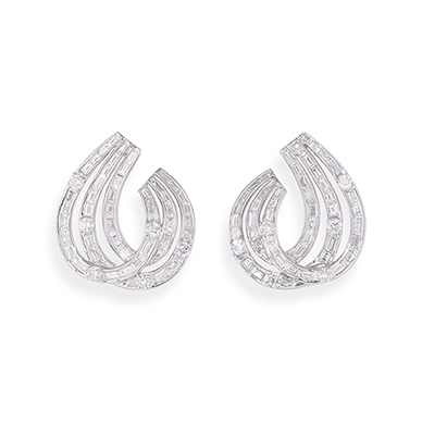 Each earring is designed as a curving form, fully aligned with carefully placed baguette and full-cut diamonds, mounted in gold.