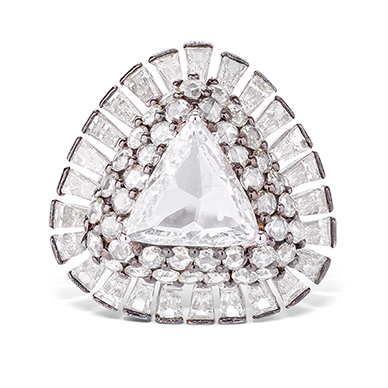 Centring on a triangular rose-cut diamond with a primary two-tier surround of circular rose-cut diamonds and a secondary open-channel of baguette diamonds. Mounted in white gold.