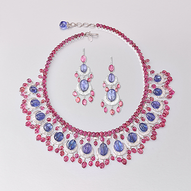 Comprising of a necklace and a pair of earrings similarly designed with crescents of tapered baguette diamonds; each crescent has a tanzanite bead and suspending a fringe of spinels, set in gold.