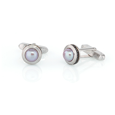 Each centring on a pearl to a raised circular surround with channel-set diamonds on the side rim, mounted in gold.