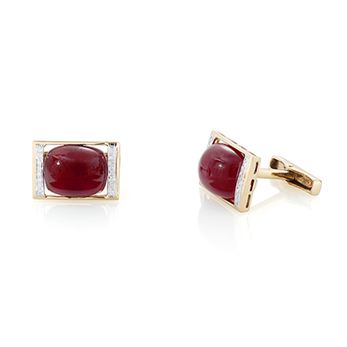 Each cufflink comprises a central oval-shaped cabochon ruby flanked with full-cut diamonds on either side, mounted in gold.