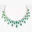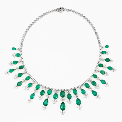 Designed as a row of full-cut diamonds, suspending a gently graduated fringe of oval and pear shaped emeralds interspersed with a floret of three triangle cut diamonds,with a total emerald weight of 54.63 carats and diamond weight 14.79 carats, mounted in 18 K gold.