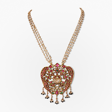 Designed as a stylized flower-head, flanked by a pair of parrots, set with table-cut 'polki' diamonds in center, rubies and emeralds, suspending a fringe of seed pearls, further suspending to a seed pearl chain, mounted in gold.