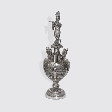 The attractive ornamentation of scrolling foliage intertwined with animals, birds and hunting scenes was the most venerated style of Indian silverware in the late 19th century. Also aiding the success of the Cutch style were the supportive efforts made by the Raos of Cutch ensuring examples of the region's silverware were displayed in every possible international exhibition.