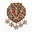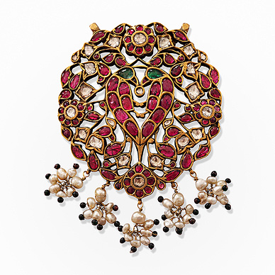 Designed as a stylized flower-head, flanked by a pair of parrots, set with table-cut 'polki' diamonds, rubies and emeralds, suspending a fringe of seed pearls, mounted in gold.