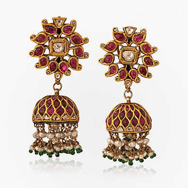Each designed as a hemisphere, kundan-set with table-cut 'polki' diamonds and rubies, suspending a fringe of seed pearls, to a similarly set openwork surmount designed as a flower head, mounted in gold.