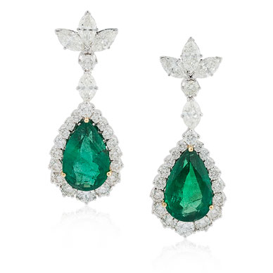 Each centering on a pear shaped Zambian emerald with a total weight of 18.01 carats, with a diamond-set surround, suspended by a marquise shaped diamond, a round-cut diamond and a cluster of three marquise shaped diamonds, with a total diamond weight of 8.61 carats, mounted in 18 K gold.